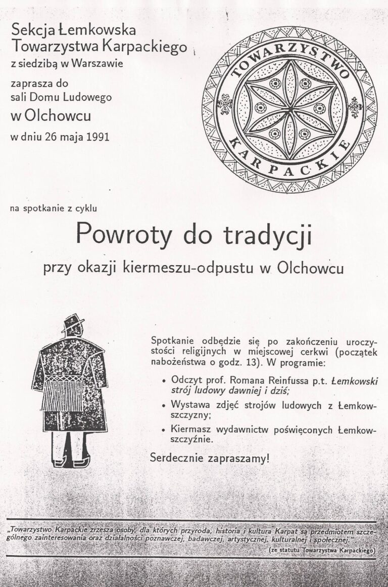 Jak już pokrótce wspomniałam, powrót do tradycji Kermeszowych nastąpił z inicjatywy osób trzecich – Towarzystwa Karpackiego, a dokładniej Andrzeja Wielochy i Tadeusza Kiełbasińskiego. Pomysł organizacji Kermeszy narodził się u nieżyjącego już Wasyla Toropyły. W 1991 roku Towarzystwo Karpackie, realizując projekt „Powroty do tradycji” zorganizowało pierwszy Kermesz w Olchowcu. Tadeusz Kiełbasiński, Stanisław Kryciński oraz Andrzej Wielocha namówili mieszkańców do założenia swoich ludowych strojów, pozowania do zdjęć, śpiewania i co najtrudniejsze – pokazania, że są Łemkami. Całość udała się dzięki pomocy Mikołaja Gabły, księdza Jana Pipki oraz Stanisława Toropiły który pełnił funkcję sołtysa.